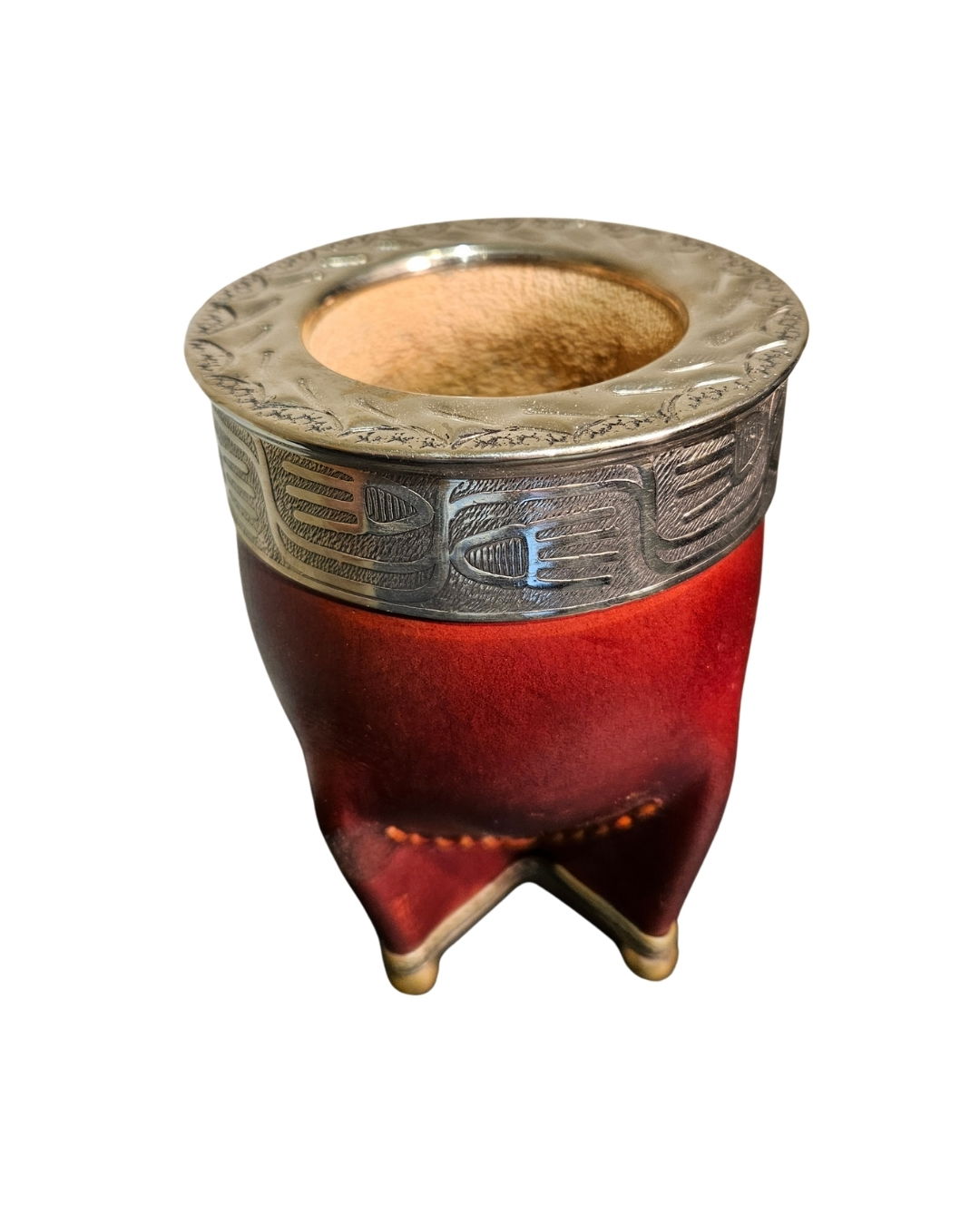 1 Mate imperial, base de alpaca y pelotas de bronce, guarda de alpaca, cuero marron liso- interior calabaza