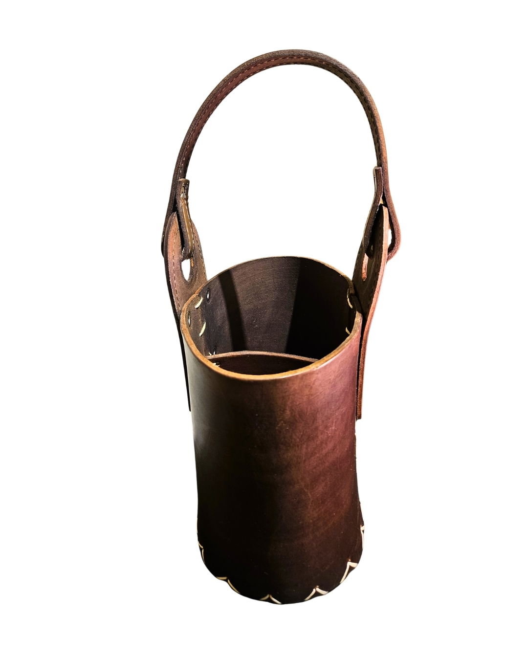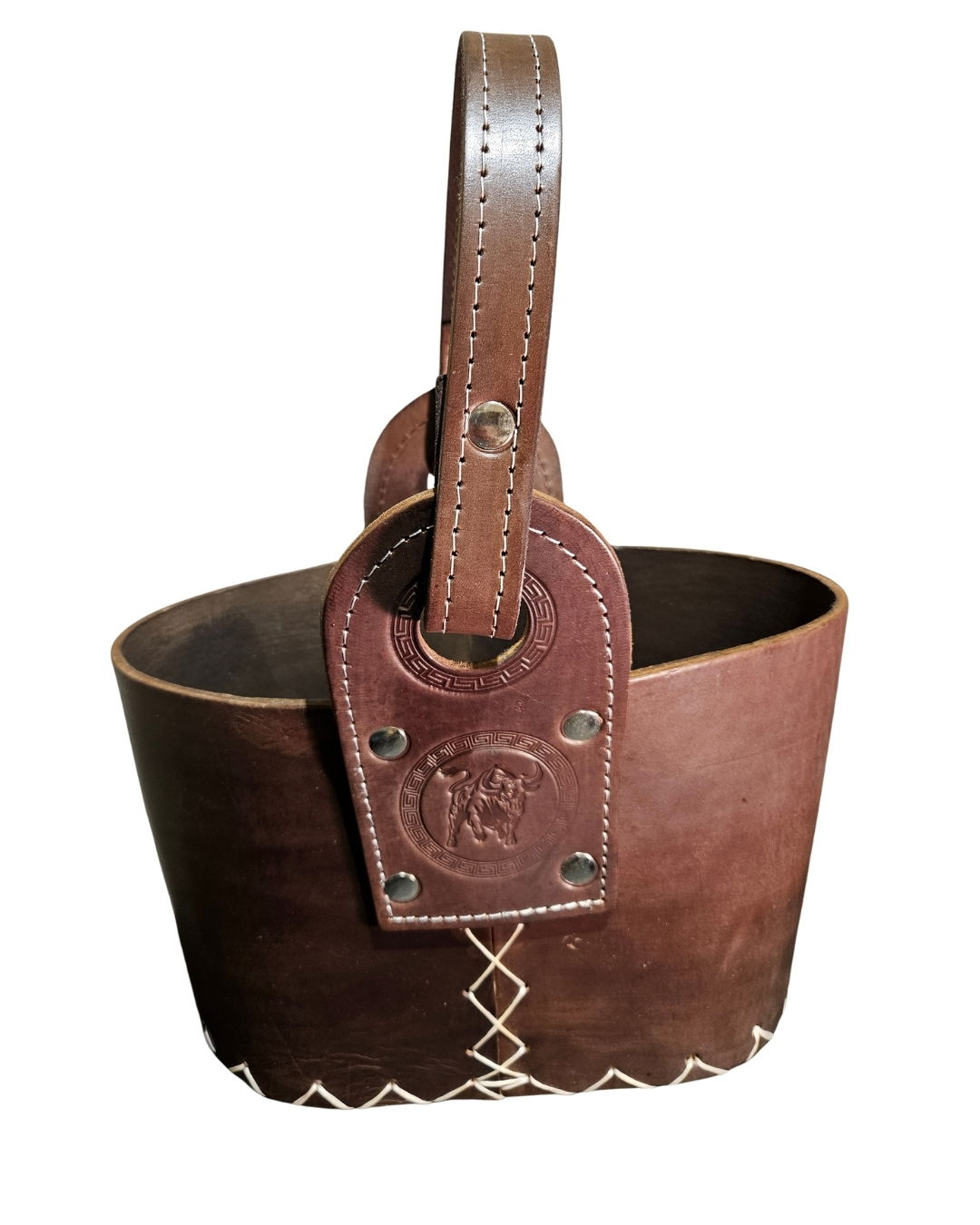 1 CANASTA OVALADA CHOCOLATE 100% CUERO VACUNO CON DIVISIÓN.